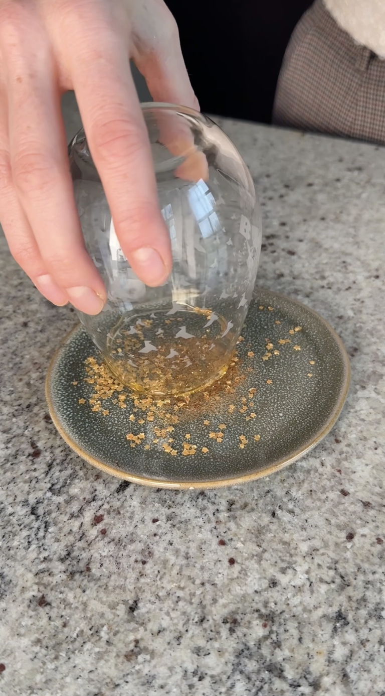 - Neem je BRU®-glas en dip de rand eerst in honing, daarna in eetbare glitter voor een feestelijke gouden rand.