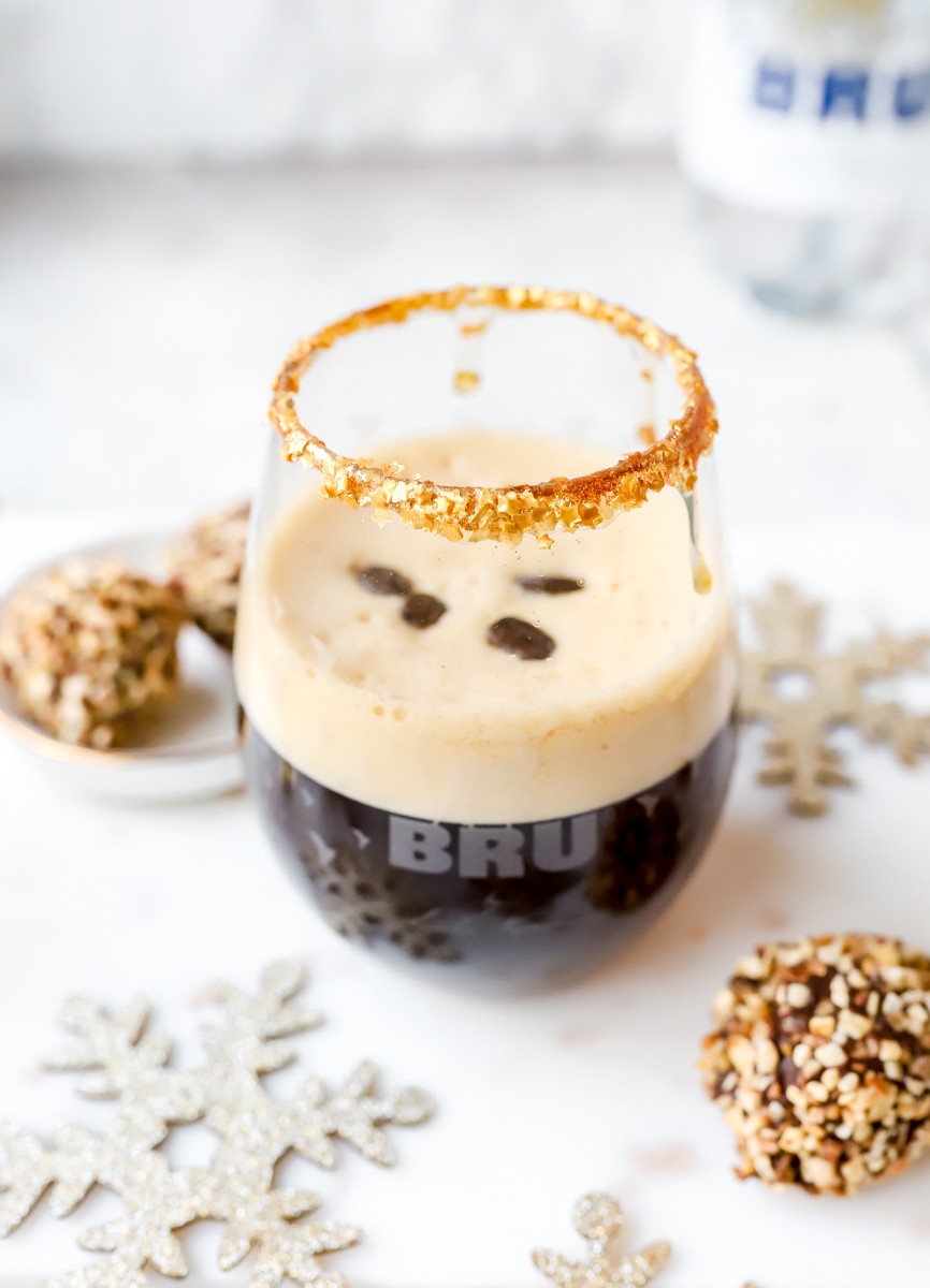 Laurence, beter bekend als As Cooked By Ginger, geeft haar favoriete dessertcocktail een feestelijke upgrade. Ze maakt een klassieke espresso martini, maar pimpt die met BRU voor een lichtere, sprankelende finish. Het resultaat? Een bubbeltjes-dessert in een glas, afgewerkt met een gouden glitterrandje en koffiebonen.